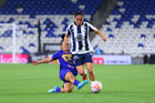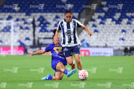 Guadalupe, Nuevo León, 1 de abril de 2026. Marcela Restrepo y Nayeli Diaz, durante el partido correspondiente a la jornada 15 del torneo Clausura 2026 de la Liga BBVA MX Femenil, entre las Rayadas del Monterrey y las Pumas de la UNAM, realizado en el estadio BBVA. Foto: Imago7/