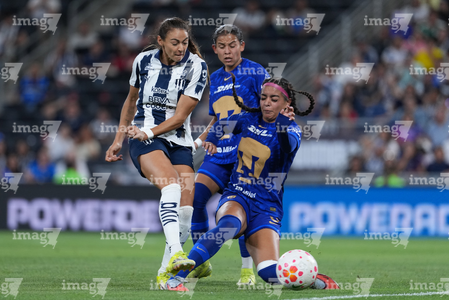 Guadalupe, Nuevo León, 1 de abril de 2026. Alejandra Guerrero, Ariatna Dorantes y Heidi González, durante el partido correspondiente a la jornada 15 del torneo Clausura 2026 de la Liga BBVA MX Femenil, entre las Rayadas del Monterrey y las Pumas de la UNAM, realizado en el estadio BBVA. Foto: Imago7/Nora Pamela