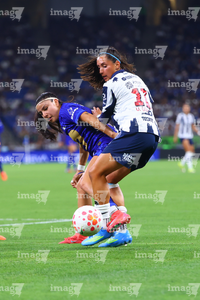 Guadalupe, Nuevo León, 1 de abril de 2026. Lucía García y Wendy Bonilla, durante el partido correspondiente a la jornada 15 del torneo Clausura 2026 de la Liga BBVA MX Femenil, entre las Rayadas del Monterrey y las Pumas de la UNAM, realizado en el estadio BBVA. Foto: Imago7/