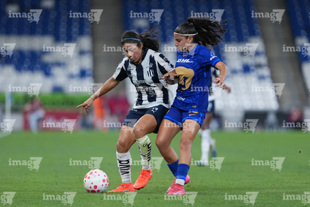 Guadalupe, Nuevo León, 1 de abril de 2026. Valerie Vargas y Alejandra Guerrero, durante el partido correspondiente a la jornada 15 del torneo Clausura 2026 de la Liga BBVA MX Femenil, entre las Rayadas del Monterrey y las Pumas de la UNAM, realizado en el estadio BBVA. Foto: Imago7/ David Arzamendi