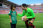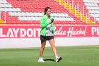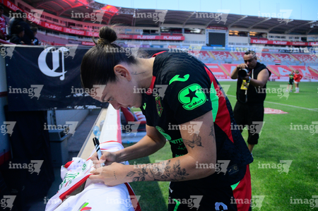 Aguascalientes, Aguascalientes, 1 de abril de 2026. Norma Palafox firma playera, durante el partido correspondiente a la jornada 15 del torneo Clausura 2026 de la Liga BBVA MX Femenil, entre las Centellas del Necaxa y las Bravas de FC Juárez, realizado en el estadio Victoria. Foto: Imago7/ Pablo Ramírez