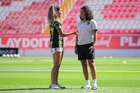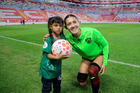Aguascalientes, Aguascalientes, 1 de abril de 2026. Bianca Mora entregó balón con valor a aficionada, durante el partido correspondiente a la jornada 15 del torneo Clausura 2026 de la Liga BBVA MX Femenil, entre las Centellas del Necaxa y las Bravas de FC Juárez, realizado en el estadio Victoria. Foto: Imago7/ Pablo Ramírez