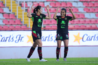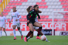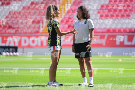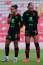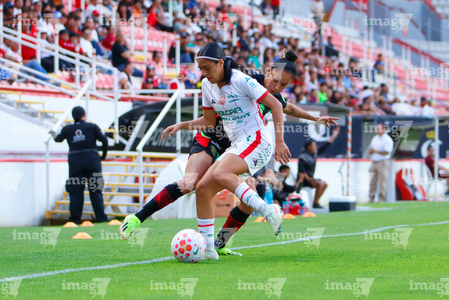Aguascalientes, Aguascalientes, 1 de abril de 2026. Sashenka Porras y Giselle Espinoza, durante el partido correspondiente a la jornada 15 del torneo Clausura 2026 de la Liga BBVA MX Femenil, entre las Centellas del Necaxa y las Bravas de FC Juárez, realizado en el estadio Victoria. Foto: Imago7/ Pablo Ramírez