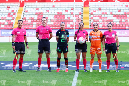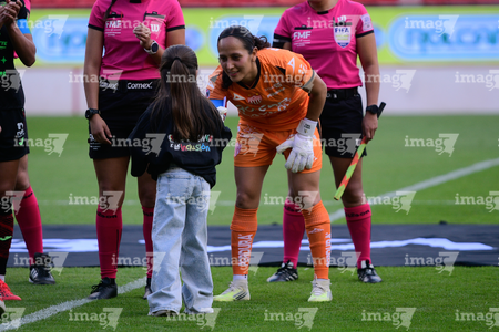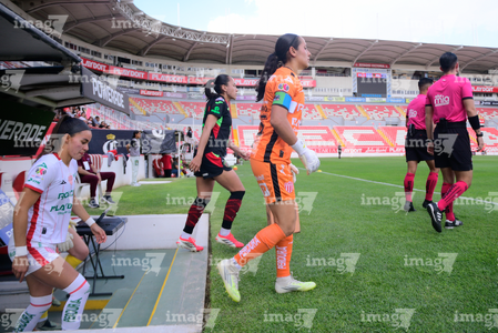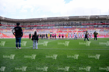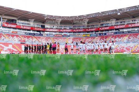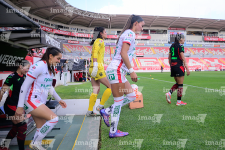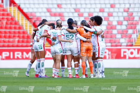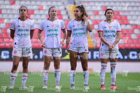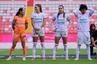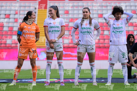 Aguascalientes, Aguascalientes, 1 de abril de 2026. Protocolo, durante el partido correspondiente a la jornada 15 del torneo Clausura 2026 de la Liga BBVA MX Femenil, entre las Centellas del Necaxa y las Bravas de FC Juárez, realizado en el estadio Victoria. Foto: Imago7/ Rogelio Davila
