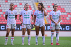 Aguascalientes, Aguascalientes, 1 de abril de 2026. Paula Salto, Meghan Cavanaugh, Acacia Edwards y Guadalupe Fernández, durante el partido correspondiente a la jornada 15 del torneo Clausura 2026 de la Liga BBVA MX Femenil, entre las Centellas del Necaxa y las Bravas de FC Juárez, realizado en el estadio Victoria. Foto: Imago7/ Pablo Ramírez