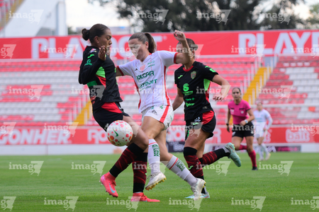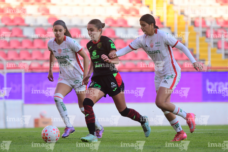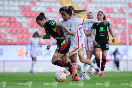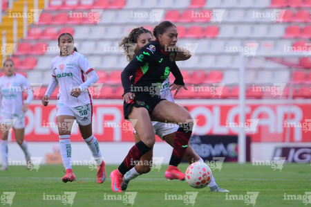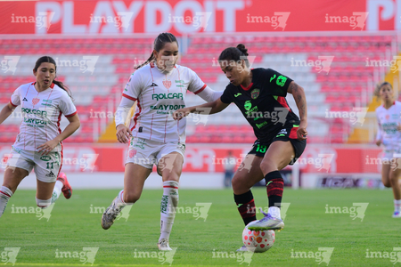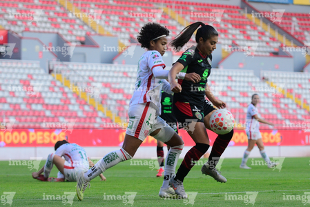 Aguascalientes, Aguascalientes, 1 de abril de 2026. Acacia Edwards y Aisha Solorzano, durante el partido correspondiente a la jornada 15 del torneo Clausura 2026 de la Liga BBVA MX Femenil, entre las Centellas del Necaxa y las Bravas de FC Juárez, realizado en el estadio Victoria. Foto: Imago7/ Pablo Ramírez