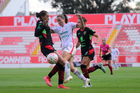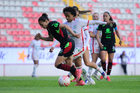 Aguascalientes, Aguascalientes, 1 de abril de 2026. Ella Sanchez y Zoé Medellín, durante el partido correspondiente a la jornada 15 del torneo Clausura 2026 de la Liga BBVA MX Femenil, entre las Centellas del Necaxa y las Bravas de FC Juárez, realizado en el estadio Victoria. Foto: Imago7/ Pablo Ramírez