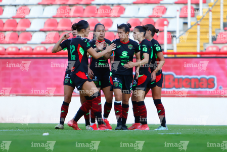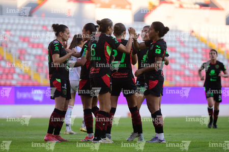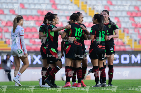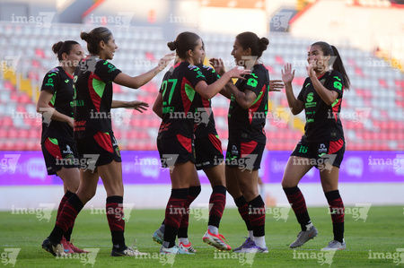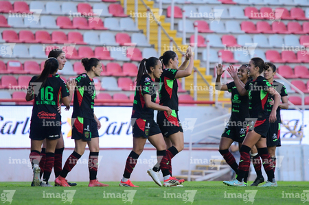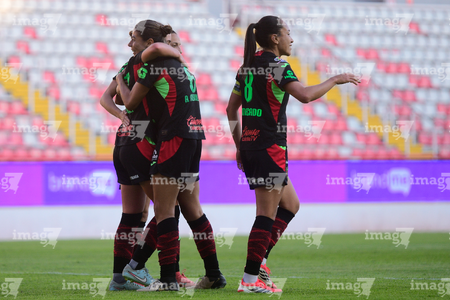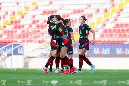 Aguascalientes, Aguascalientes, 1 de abril de 2026. Jugadoras del FC Juárez femenil en festejo de gol, durante el partido correspondiente a la jornada 15 del torneo Clausura 2026 de la Liga BBVA MX Femenil, entre las Centellas del Necaxa y las Bravas de FC Juárez, realizado en el estadio Victoria. Foto: Imago7/ Rogelio Davila