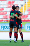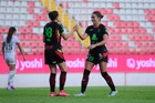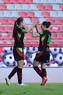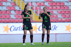 Aguascalientes, Aguascalientes, 1 de abril de 2026. Blanca Solis y Giselle Espinoza en festejo de gol, durante el partido correspondiente a la jornada 15 del torneo Clausura 2026 de la Liga BBVA MX Femenil, entre las Centellas del Necaxa y las Bravas de FC Juárez, realizado en el estadio Victoria. Foto: Imago7/ Pablo Ramírez