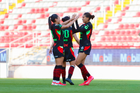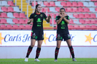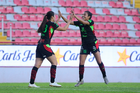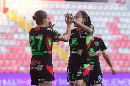 Aguascalientes, Aguascalientes, 1 de abril de 2026. Blanca Solis y Aurelie Kaci en festejo de gol, durante el partido correspondiente a la jornada 15 del torneo Clausura 2026 de la Liga BBVA MX Femenil, entre las Centellas del Necaxa y las Bravas de FC Juárez, realizado en el estadio Victoria. Foto: Imago7/ Pablo Ramírez