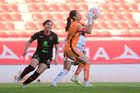 Aguascalientes, Aguascalientes, 1 de abril de 2026. Meghan Cavanaugh, durante el partido correspondiente a la jornada 15 del torneo Clausura 2026 de la Liga BBVA MX Femenil, entre las Centellas del Necaxa y las Bravas de FC Juárez, realizado en el estadio Victoria. Foto: Imago7/ Pablo Ramírez