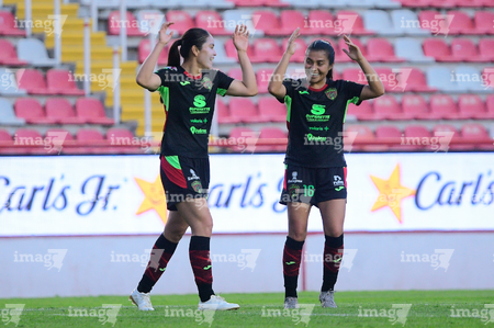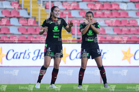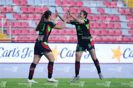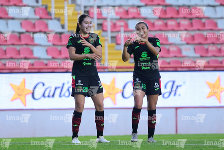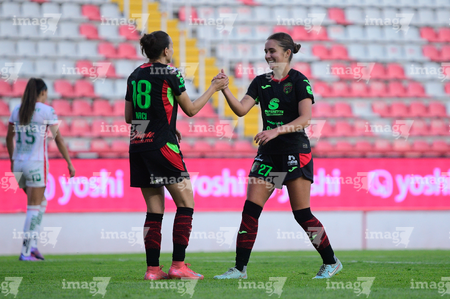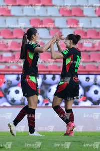 Aguascalientes, Aguascalientes, 1 de abril de 2026. Ella Sanchez y Liliana Mercado en festejo de gol, durante el partido correspondiente a la jornada 15 del torneo Clausura 2026 de la Liga BBVA MX Femenil, entre las Centellas del Necaxa y las Bravas de FC Juárez, realizado en el estadio Victoria. Foto: Imago7/ Pablo Ramírez