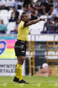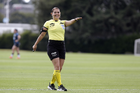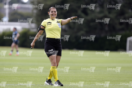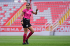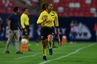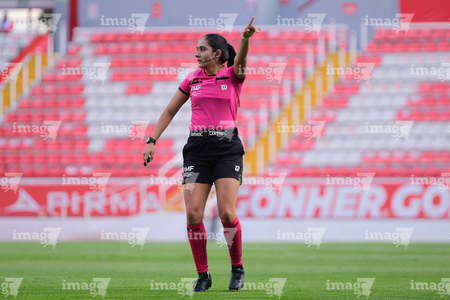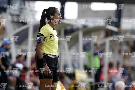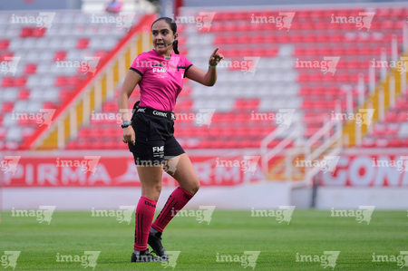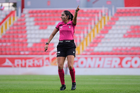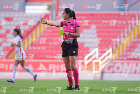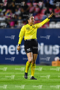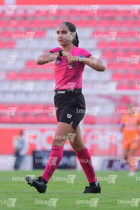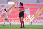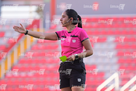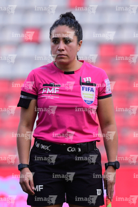 Aguascalientes, Aguascalientes, 1 de abril de 2026. Montserrat Pérez Comellas, árbitra central, durante el partido correspondiente a la jornada 15 del torneo Clausura 2026 de la Liga BBVA MX Femenil, entre las Centellas del Necaxa y las Bravas de FC Juárez, realizado en el estadio Victoria. Foto: Imago7/ Pablo Ramírez