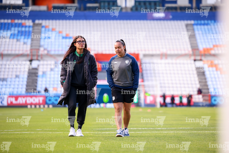Pachuca, Hidalgo, 5 de abril de 2026. Armando Martínez y Karla Nieto, durante el partido correspondiente a la jornada 16 del torneo Clausura 2026 de la Liga BBVA MX Femenil, entre las Tuzas del Pachuca y las Esmeraldas del León, realizado en el estadio Hidalgo. Foto: Imago7/ Jacqueline Pedraza