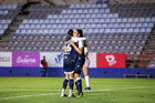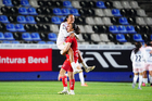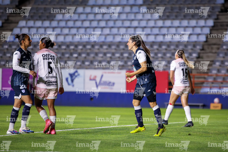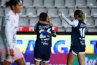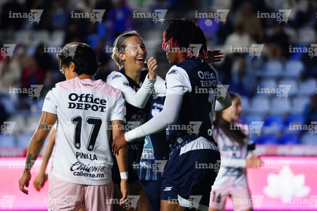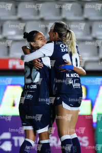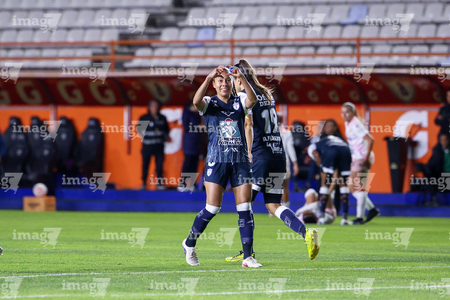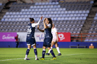 Pachuca, Hidalgo, 5 de abril de 2026. Paola García y Nina Nicosia en festejo de gol, durante el partido correspondiente a la jornada 16 del torneo Clausura 2026 de la Liga BBVA MX Femenil, entre las Tuzas del Pachuca y las Esmeraldas del León, realizado en el estadio Hidalgo. Foto: Imago7/ Jacqueline Pedraza