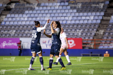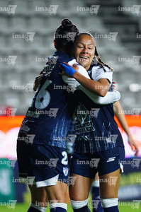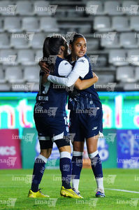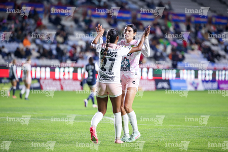 Pachuca, Hidalgo, 5 de abril de 2026. Karla Nieto y Paola García en festejo de gol, durante el partido correspondiente a la jornada 16 del torneo Clausura 2026 de la Liga BBVA MX Femenil, entre las Tuzas del Pachuca y las Esmeraldas del León, realizado en el estadio Hidalgo. Foto: Imago7/ Elizabeth Hernández