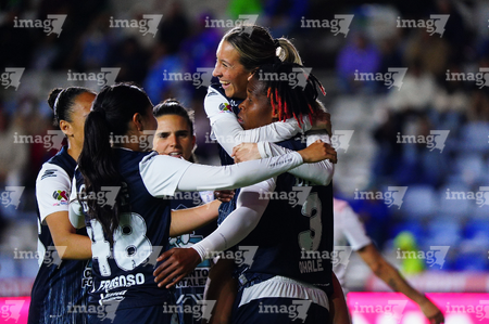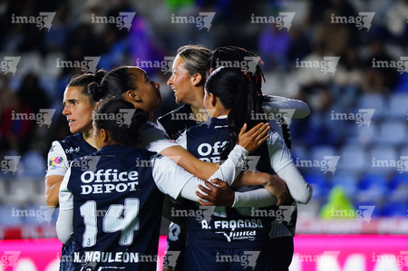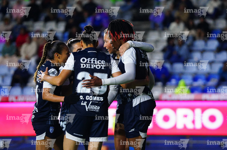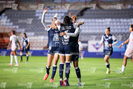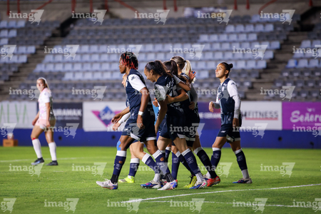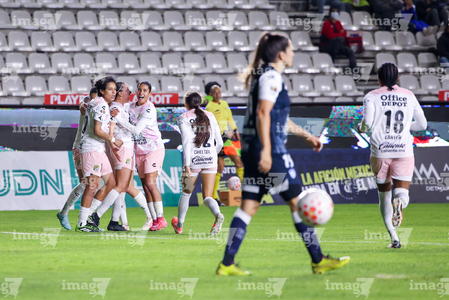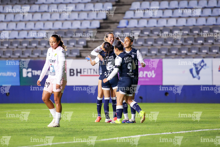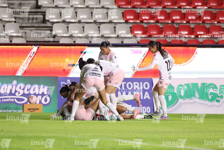Pachuca, Hidalgo, 5 de abril de 2026. Jugadoras de Tuzas en festejo de gol, durante el partido correspondiente a la jornada 16 del torneo Clausura 2026 de la Liga BBVA MX Femenil, entre las Tuzas del Pachuca y las Esmeraldas del León, realizado en el estadio Hidalgo. Foto: Imago7/ Elizabeth Hernández