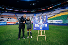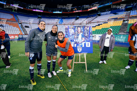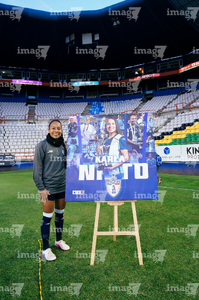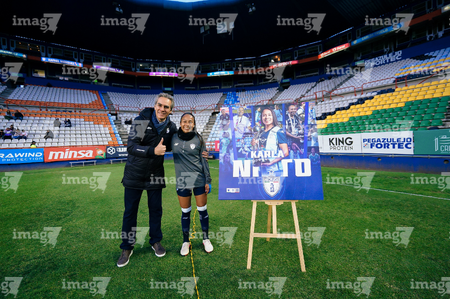 Pachuca, Hidalgo, 5 de abril de 2026. Karla Nieto devela un palco en su nombre, durante el partido correspondiente a la jornada 16 del torneo Clausura 2026 de la Liga BBVA MX Femenil, entre las Tuzas del Pachuca y las Esmeraldas del León, realizado en el estadio Hidalgo. Foto: Imago7/ Elizabeth Hernández