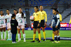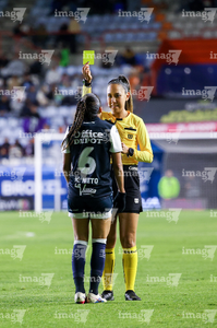 Pachuca, Hidalgo, 5 de abril de 2026. María Fernanda Márquez, árbitra central, muestra tarjeta amarilla de amonestación a Karla Nieto, durante el partido correspondiente a la jornada 16 del torneo Clausura 2026 de la Liga BBVA MX Femenil, entre las Tuzas del Pachuca y las Esmeraldas del León, realizado en el estadio Hidalgo. Foto: Imago7/ Elizabeth Hernández