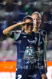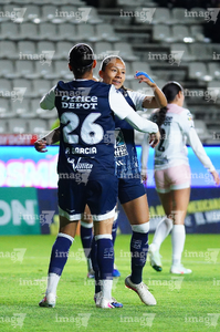 Pachuca, Hidalgo, 5 de abril de 2026. Paola García y Karla Nieto en festejo de gol, durante el partido correspondiente a la jornada 16 del torneo Clausura 2026 de la Liga BBVA MX Femenil, entre las Tuzas del Pachuca y las Esmeraldas del León, realizado en el estadio Hidalgo. Foto: Imago7/ Jacqueline Pedraza