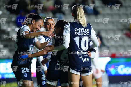 Pachuca, Hidalgo, 5 de abril de 2026. Jugadoras de Tuzas en festejo de gol, durante el partido correspondiente a la jornada 16 del torneo Clausura 2026 de la Liga BBVA MX Femenil, entre las Tuzas del Pachuca y las Esmeraldas del León, realizado en el estadio Hidalgo. Foto: Imago7/ Jacqueline Pedraza