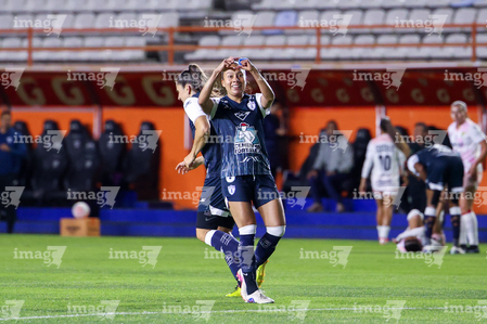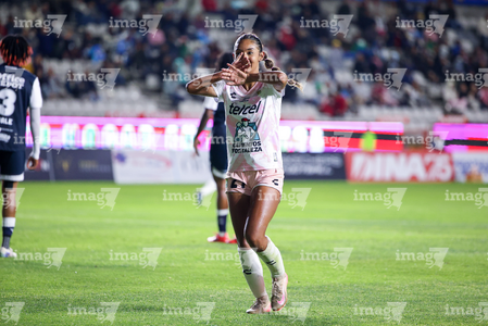 Pachuca, Hidalgo, 5 de abril de 2026. Paola García en festejo de gol, durante el partido correspondiente a la jornada 16 del torneo Clausura 2026 de la Liga BBVA MX Femenil, entre las Tuzas del Pachuca y las Esmeraldas del León, realizado en el estadio Hidalgo. Foto: Imago7/ Elizabeth Hernández