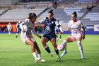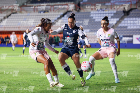 Pachuca, Hidalgo, 5 de abril de 2026. Andrea Pereira, Karla Nieto y Kenti Robles, durante el partido correspondiente a la jornada 16 del torneo Clausura 2026 de la Liga BBVA MX Femenil, entre las Tuzas del Pachuca y las Esmeraldas del León, realizado en el estadio Hidalgo. Foto: Imago7/ Jacqueline Pedraza