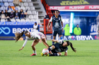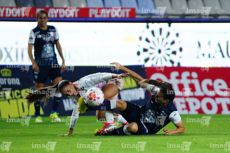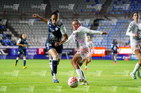 Pachuca, Hidalgo, 5 de abril de 2026. Solange Lemos y Andrea Pereira, durante el partido correspondiente a la jornada 16 del torneo Clausura 2026 de la Liga BBVA MX Femenil, entre las Tuzas del Pachuca y las Esmeraldas del León, realizado en el estadio Hidalgo. Foto: Imago7/ Jacqueline Pedraza