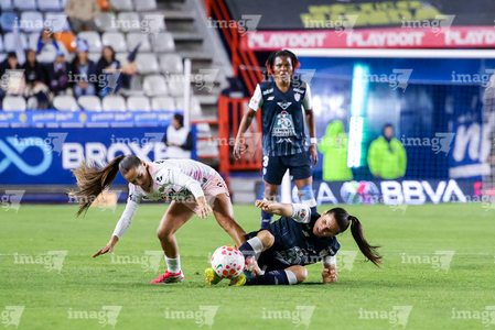 Pachuca, Hidalgo, 5 de abril de 2026. Aline Gomes y Karen Jasso, durante el partido correspondiente a la jornada 16 del torneo Clausura 2026 de la Liga BBVA MX Femenil, entre las Tuzas del Pachuca y las Esmeraldas del León, realizado en el estadio Hidalgo. Foto: Imago7/ Elizabeth Hernández