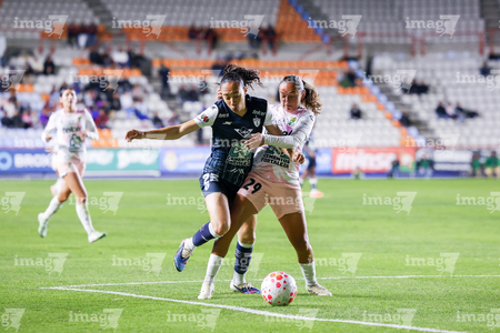 Pachuca, Hidalgo, 5 de abril de 2026. Solange Lemos y Andrea Pereira, durante el partido correspondiente a la jornada 16 del torneo Clausura 2026 de la Liga BBVA MX Femenil, entre las Tuzas del Pachuca y las Esmeraldas del León, realizado en el estadio Hidalgo. Foto: Imago7/ Elizabeth Hernández