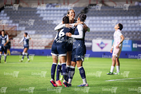 Pachuca, Hidalgo, 5 de abril de 2026. Paola García, Karla Nieto y Nina Nicosia en festejo de gol, durante el partido correspondiente a la jornada 16 del torneo Clausura 2026 de la Liga BBVA MX Femenil, entre las Tuzas del Pachuca y las Esmeraldas del León, realizado en el estadio Hidalgo. Foto: Imago7/ Jacqueline Pedraza