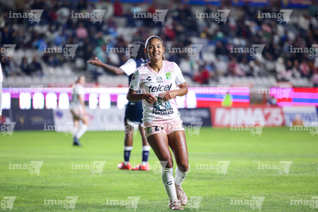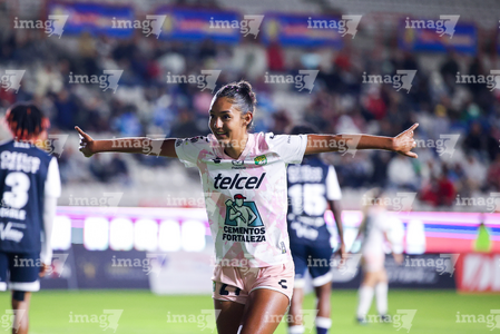 Pachuca, Hidalgo, 5 de abril de 2026. Andrea Pereira en festejo de gol, durante el partido correspondiente a la jornada 16 del torneo Clausura 2026 de la Liga BBVA MX Femenil, entre las Tuzas del Pachuca y las Esmeraldas del León, realizado en el estadio Hidalgo. Foto: Imago7/ Elizabeth Hernández