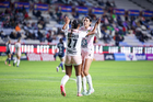 Pachuca, Hidalgo, 5 de abril de 2026. Nina Nicosia y Ohale Osinachi en festejo de gol, durante el partido correspondiente a la jornada 16 del torneo Clausura 2026 de la Liga BBVA MX Femenil, entre las Tuzas del Pachuca y las Esmeraldas del León, realizado en el estadio Hidalgo. Foto: Imago7/ Jacqueline Pedraza