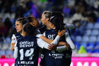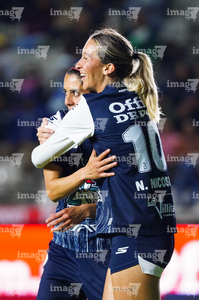 Pachuca, Hidalgo, 5 de abril de 2026. Kenti Robles y Nina Nicosia en festejo de gol, durante el partido correspondiente a la jornada 16 del torneo Clausura 2026 de la Liga BBVA MX Femenil, entre las Tuzas del Pachuca y las Esmeraldas del León, realizado en el estadio Hidalgo. Foto: Imago7/ Jacqueline Pedraza