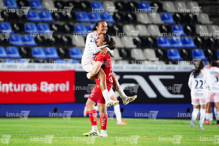 Pachuca, Hidalgo, 5 de abril de 2026. Karen Jasso y Nicole Buenfil en festejo, durante el partido correspondiente a la jornada 16 del torneo Clausura 2026 de la Liga BBVA MX Femenil, entre las Tuzas del Pachuca y las Esmeraldas del León, realizado en el estadio Hidalgo. Foto: Imago7/ Jacqueline Pedraza