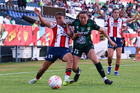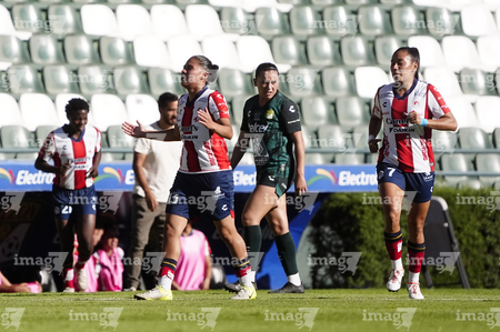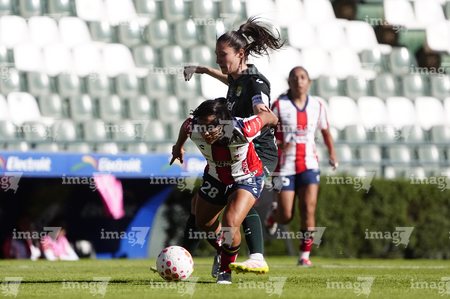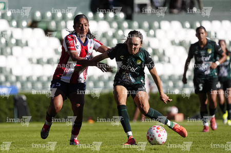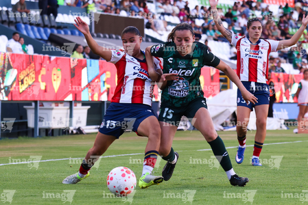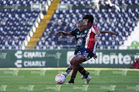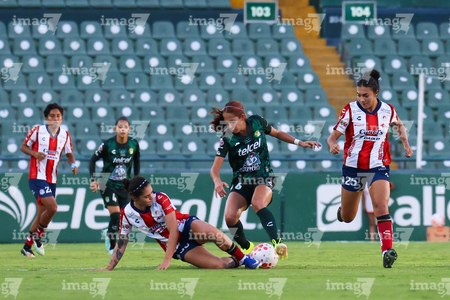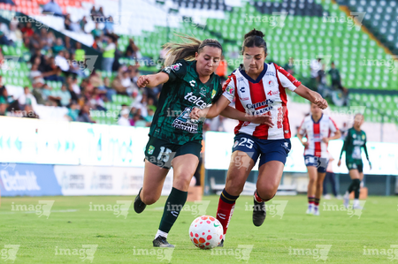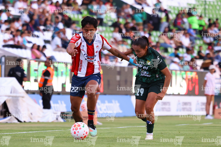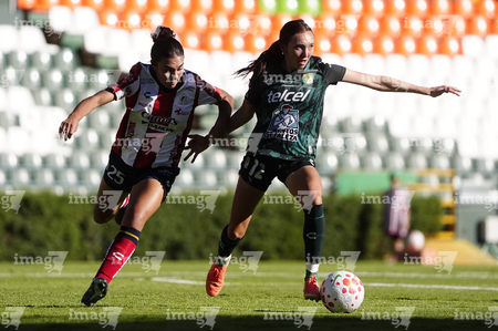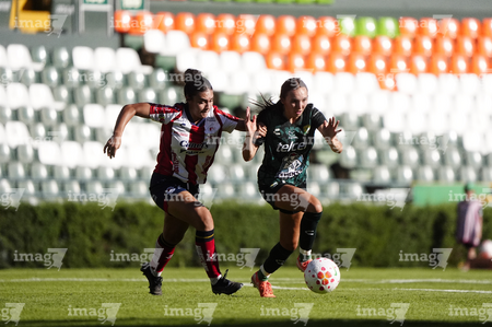 León, Guanajuato, 24 de abril de 2026. Citlali Hernández y Chelsea Lien, durante el partido correspondiente a la jornada 17 del torneo Clausura 2026 de la Liga BBVA MX Femenil, entre las Esmeraldas del León y el Atlético San Luis, realizado en el estadio León. Foto: Imago7/