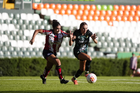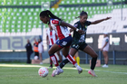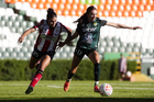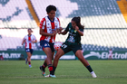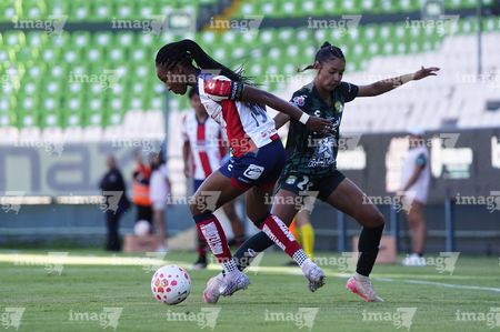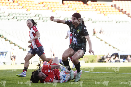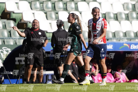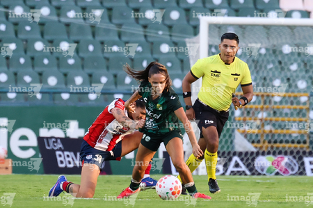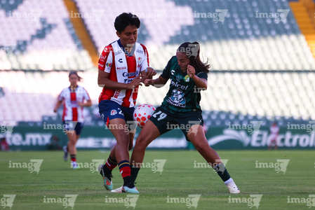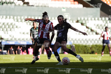 León, Guanajuato, 24 de abril de 2026. Farlyn Caicedo e Itzell Alemán, durante el partido correspondiente a la jornada 17 del torneo Clausura 2026 de la Liga BBVA MX Femenil, entre las Esmeraldas del León y el Atlético San Luis, realizado en el estadio León. Foto: Imago7/