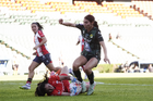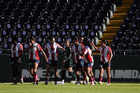 León, Guanajuato, 24 de abril de 2026. Jugadoras del Atlético de San Luis femenil en festejo de gol, durante el partido correspondiente a la jornada 17 del torneo Clausura 2026 de la Liga BBVA MX Femenil, entre las Esmeraldas del León y el Atlético San Luis, realizado en el estadio León. Foto: Imago7/
