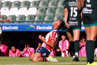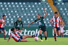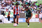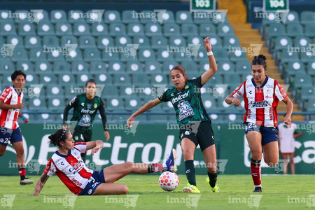 León, Guanajuato, 24 de abril de 2026. Frida Gómez y Chelsea Lien, durante el partido correspondiente a la jornada 17 del torneo Clausura 2026 de la Liga BBVA MX Femenil, entre las Esmeraldas del León y el Atlético San Luis, realizado en el estadio León. Foto: Imago7/