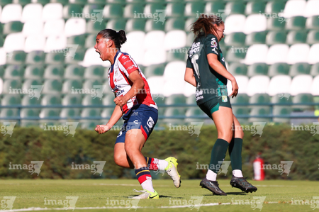 León, Guanajuato, 24 de abril de 2026. Chiara Singarella y Viridiana López en festejo de gol, durante el partido correspondiente a la jornada 17 del torneo Clausura 2026 de la Liga BBVA MX Femenil, entre las Esmeraldas del León y el Atlético San Luis, realizado en el estadio León. Foto: Imago7/