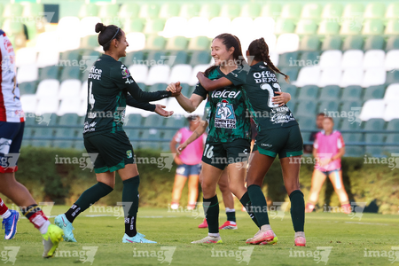 León, Guanajuato, 24 de abril de 2026. Jugadoras del León en festejo de gol, durante el partido correspondiente a la jornada 17 del torneo Clausura 2026 de la Liga BBVA MX Femenil, entre las Esmeraldas del León y el Atlético San Luis, realizado en el estadio León. Foto: Imago7/