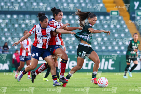 León, Guanajuato, 24 de abril de 2026. María Sánchez, Frida Gómez y Solange Lemos, durante el partido correspondiente a la jornada 17 del torneo Clausura 2026 de la Liga BBVA MX Femenil, entre las Esmeraldas del León y el Atlético San Luis, realizado en el estadio León. Foto: Imago7/