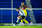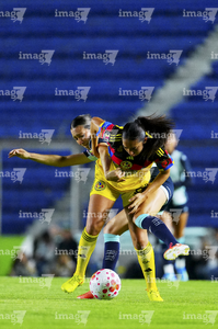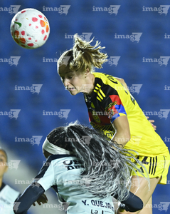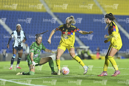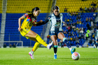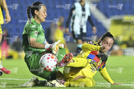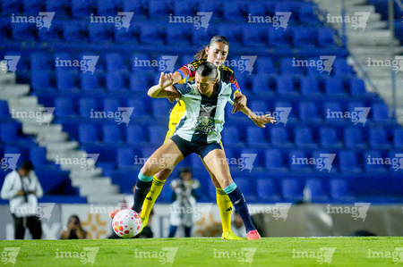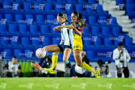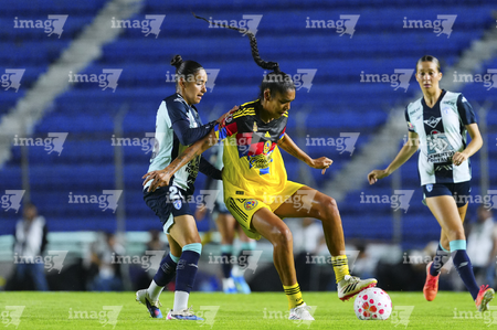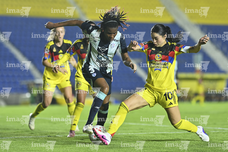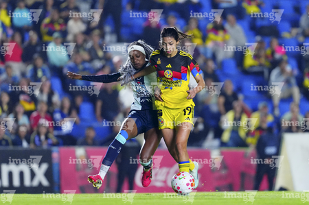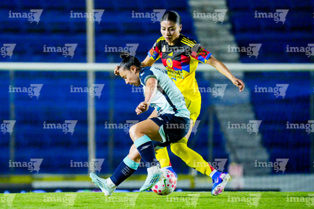 Ciudad de México, 24 de abril de 2026. Yirleidis Quejada y Montserrat Saldivar, durante el partido correspondiente a la jornada 17 del torneo Clausura 2026 de la Liga BBVA MX Femenil, entre las Águilas del América y las Tuzas del Pachuca, realizado en el estadio Ciudad de los Deportes. Foto: Imago7/ Manlio Contreras