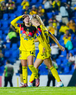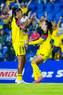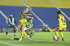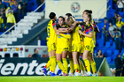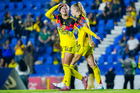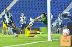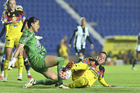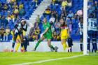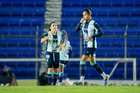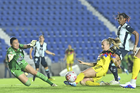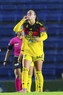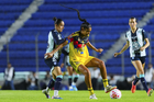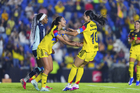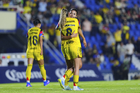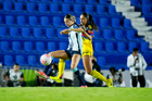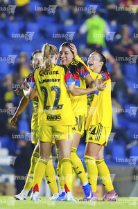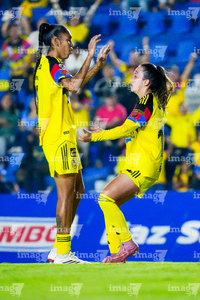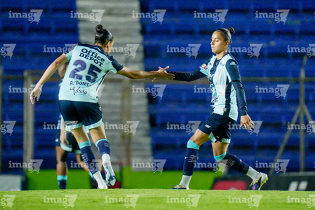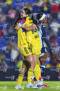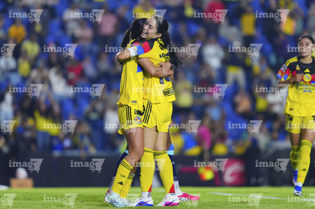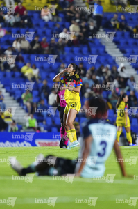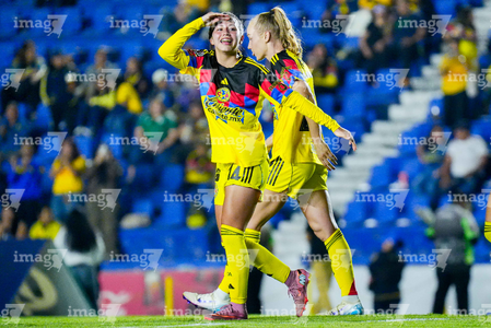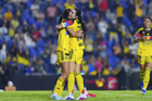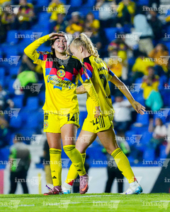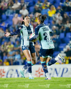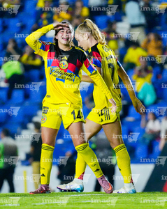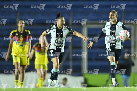 Ciudad de México, 24 de abril de 2026. Esthefanny Barreras recibe gol de Alexa Soto, durante el partido correspondiente a la jornada 17 del torneo Clausura 2026 de la Liga BBVA MX Femenil, entre las Águilas del América y las Tuzas del Pachuca, realizado en el estadio Ciudad de los Deportes. Foto: Imago7/ Diego Padilla