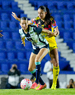 Ciudad de México, 24 de abril de 2026. Ohale Osinachi y Scarlett Camberos, durante el partido correspondiente a la jornada 17 del torneo Clausura 2026 de la Liga BBVA MX Femenil, entre las Águilas del América y las Tuzas del Pachuca, realizado en el estadio Ciudad de los Deportes. Foto: Imago7/Etzel Espinosa