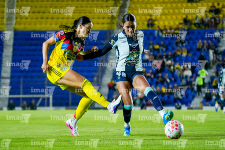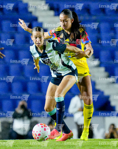Ciudad de México, 24 de abril de 2026. Esthefanny Barreras y Alexa Soto, durante el partido correspondiente a la jornada 17 del torneo Clausura 2026 de la Liga BBVA MX Femenil, entre las Águilas del América y las Tuzas del Pachuca, realizado en el estadio Ciudad de los Deportes. Foto: Imago7/Etzel Espinosa