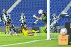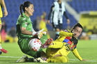 Ciudad de México, 24 de abril de 2026. Sandra Paños ataja balón a Nina Nicosia, durante el partido correspondiente a la jornada 17 del torneo Clausura 2026 de la Liga BBVA MX Femenil, entre las Águilas del América y las Tuzas del Pachuca, realizado en el estadio Ciudad de los Deportes. Foto: Imago7/ Diego Padilla