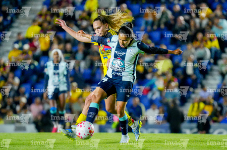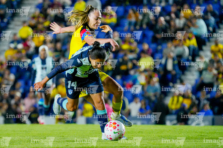Ciudad de México, 24 de abril de 2026. Esthefanny Barreras y Sarah Luebbert, durante el partido correspondiente a la jornada 17 del torneo Clausura 2026 de la Liga BBVA MX Femenil, entre las Águilas del América y las Tuzas del Pachuca, realizado en el estadio Ciudad de los Deportes. Foto: Imago7/Etzel Espinosa