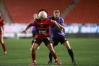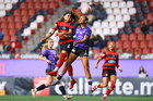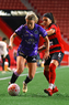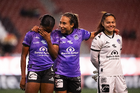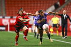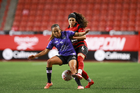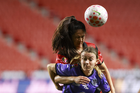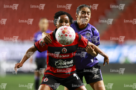 Tijuana, Baja California, 24 de abril de 2026. Amogelang Motau y Daniela García, durante el partido correspondiente a la jornada 17 del torneo Clausura 2026 de la Liga BBVA MX Femenil, entre las Xolas de Tijuana y las Cañoneras del Mazatlán FC, realizado en el estadio Caliente. Foto: Imago7/Alejandro Gutiérrez Mora