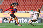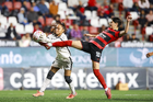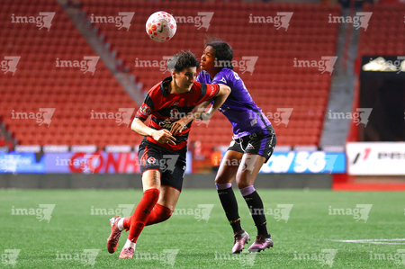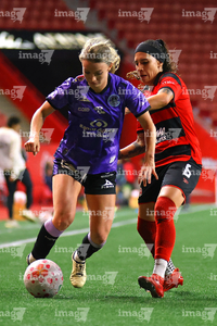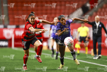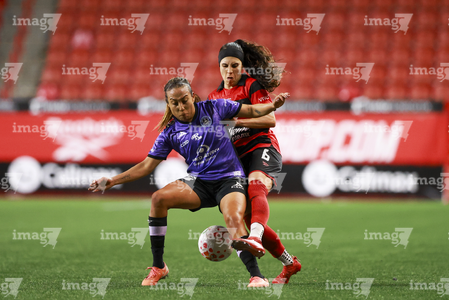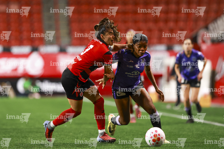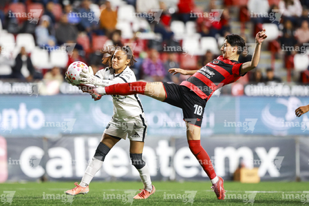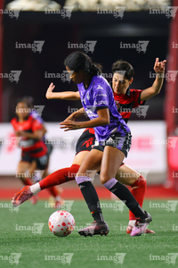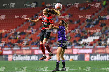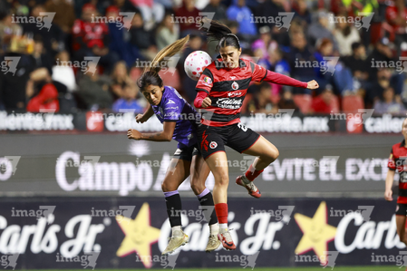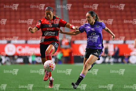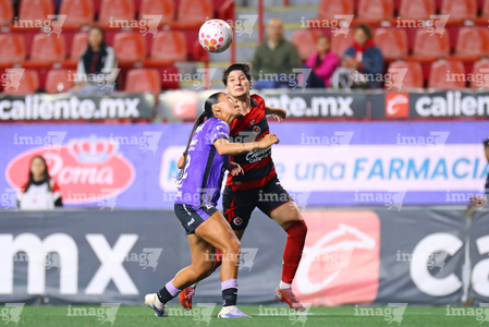 Tijuana, Baja California, 24 de abril de 2026. Conni Herrera y Michel Fong, durante el partido correspondiente a la jornada 17 del torneo Clausura 2026 de la Liga BBVA MX Femenil, entre las Xolas de Tijuana y las Cañoneras del Mazatlán FC, realizado en el estadio Caliente. Foto: Imago7/Alejandro Gutiérrez Mora
